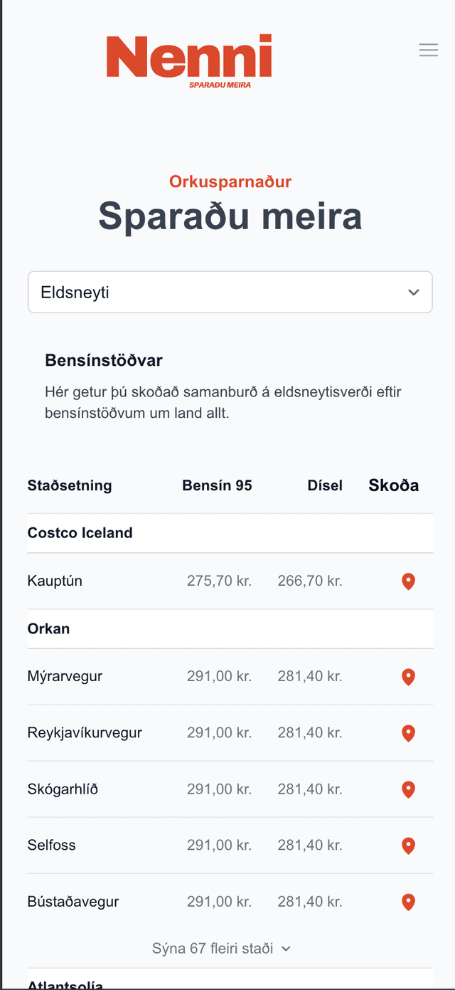 Á Nenna finnur þú yfirlit yfir ódýrasta eldsneytið/rafmagnið í þínu nágrenni.